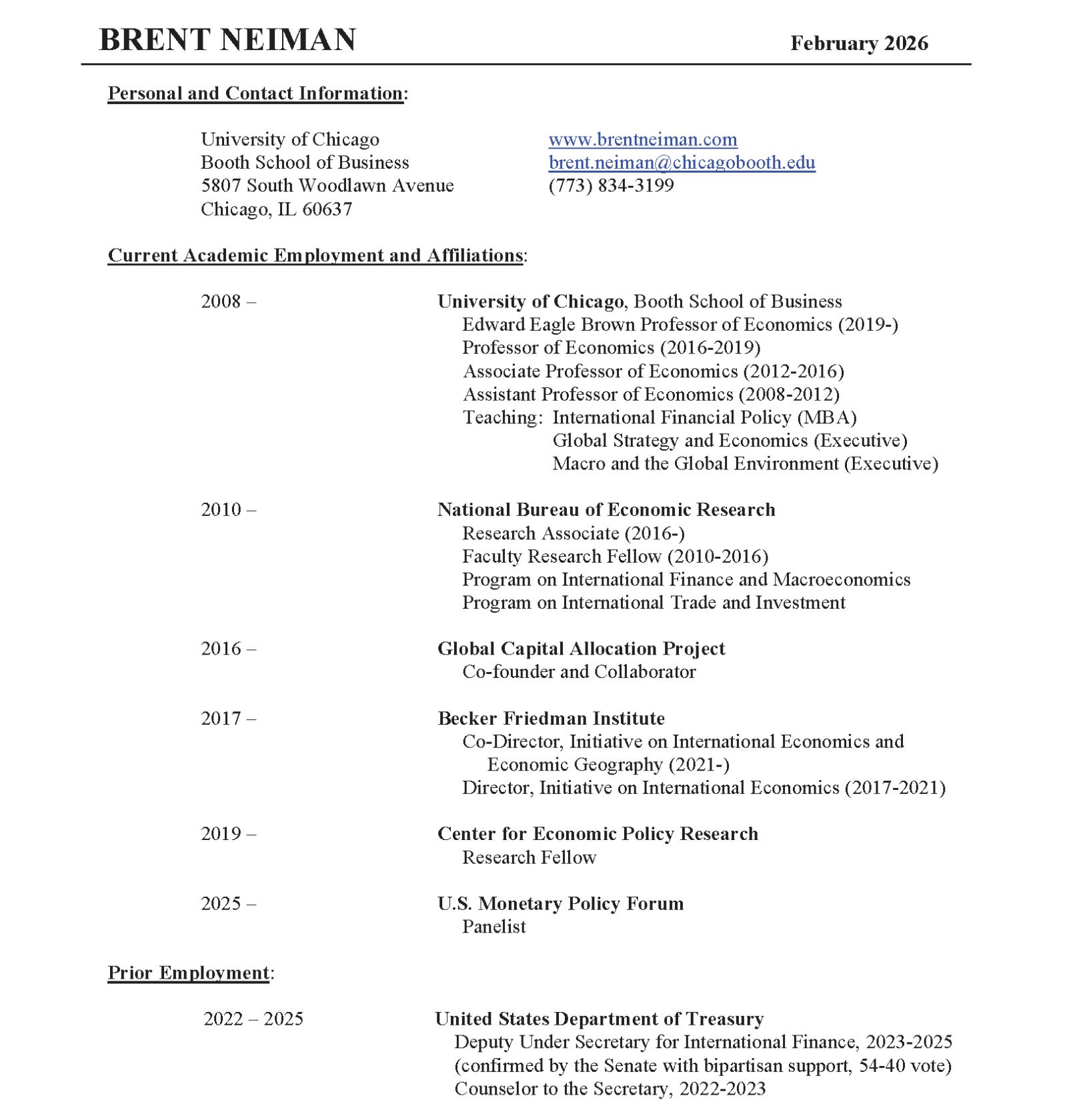 Brent Neiman is the Edward Eagle Brown Professor of Economics at Chicago Booth. He served from 2022-2025 at the U.S. Treasury as Counselor to the Secretary and as the Deputy Undersecretary for International Finance, where he worked on a broad set of international economic issues, including the bilateral relationship with China, the response to Russia’s war in Ukraine, emerging market sovereign debt, IMF governance and programs, and global financial regulation.